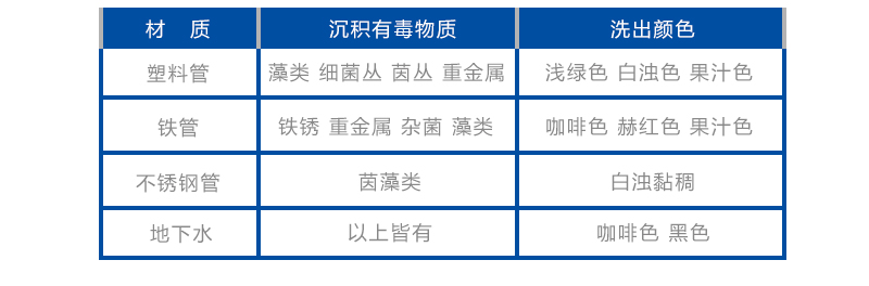 每一種材質(zhì)的水管都會產(chǎn)生積垢現(xiàn)象,塑料管容易屯積菌藻類的臟物,所以洗出來是白濁色或淺綠色或淺黃色,鐵管容易生鐵銹,所以洗出來是咖啡色;如果使用地下水,不管鐵管或塑料管,都可以洗出很黑的臟水。有些建筑物會使用不銹鋼管,但時間久了還是會洗出白濁黏稠的菌藻類。